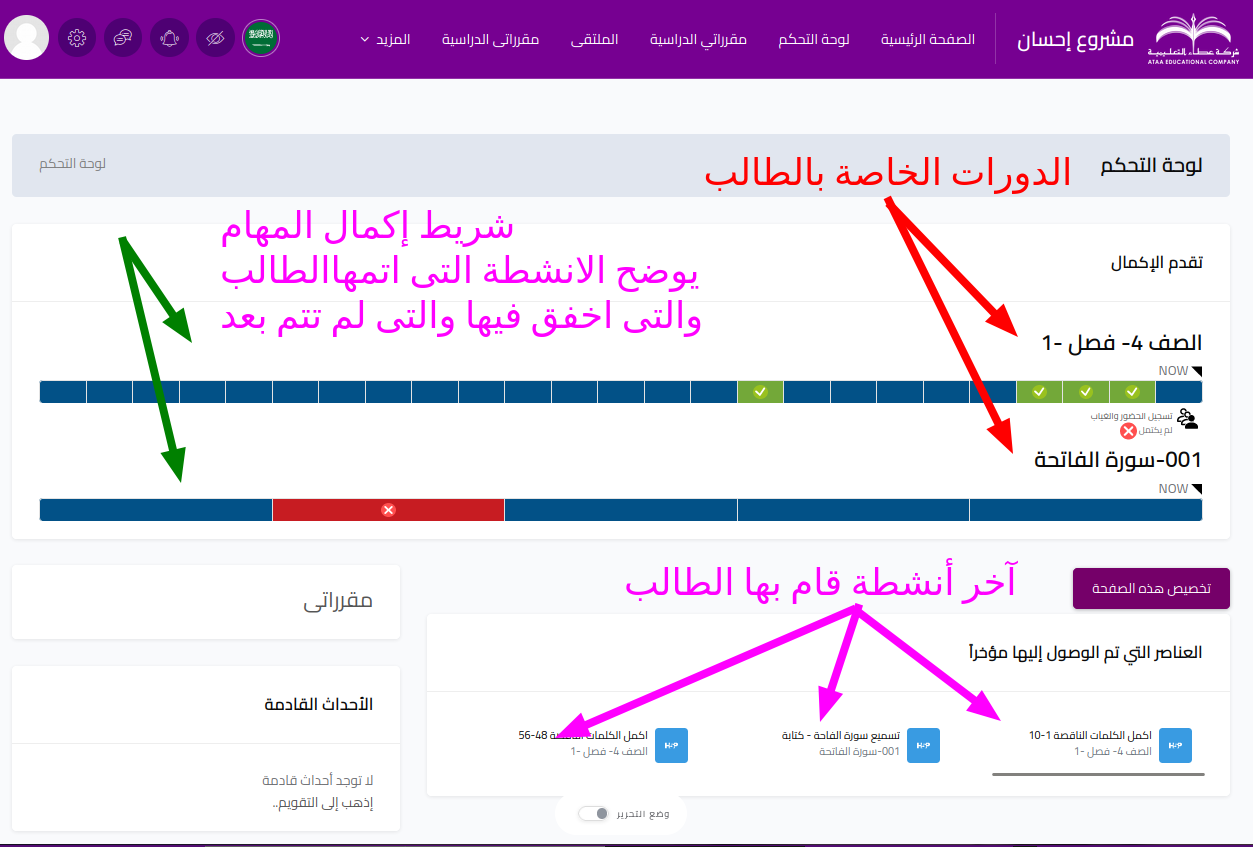 عندما تدخل الموقع بصفتك عضو مسجل (طالب, معلم , ولى أمر) سيفتح الموقع بعد الدخول عبر الكتابة اسم المستخدم وكلمة المرور , او الدخول بحساب جوجل , سيفتح مباشرة شاشة لوحة التحكم.