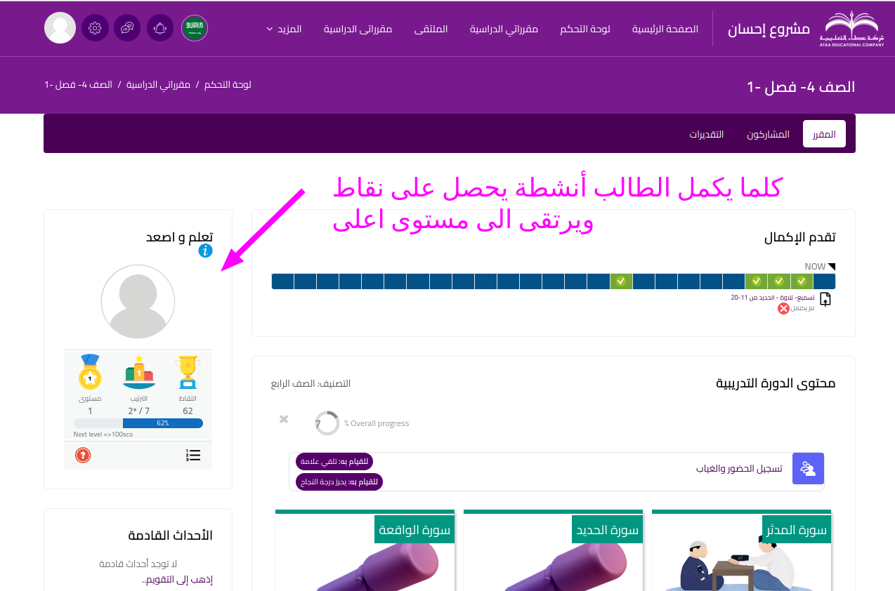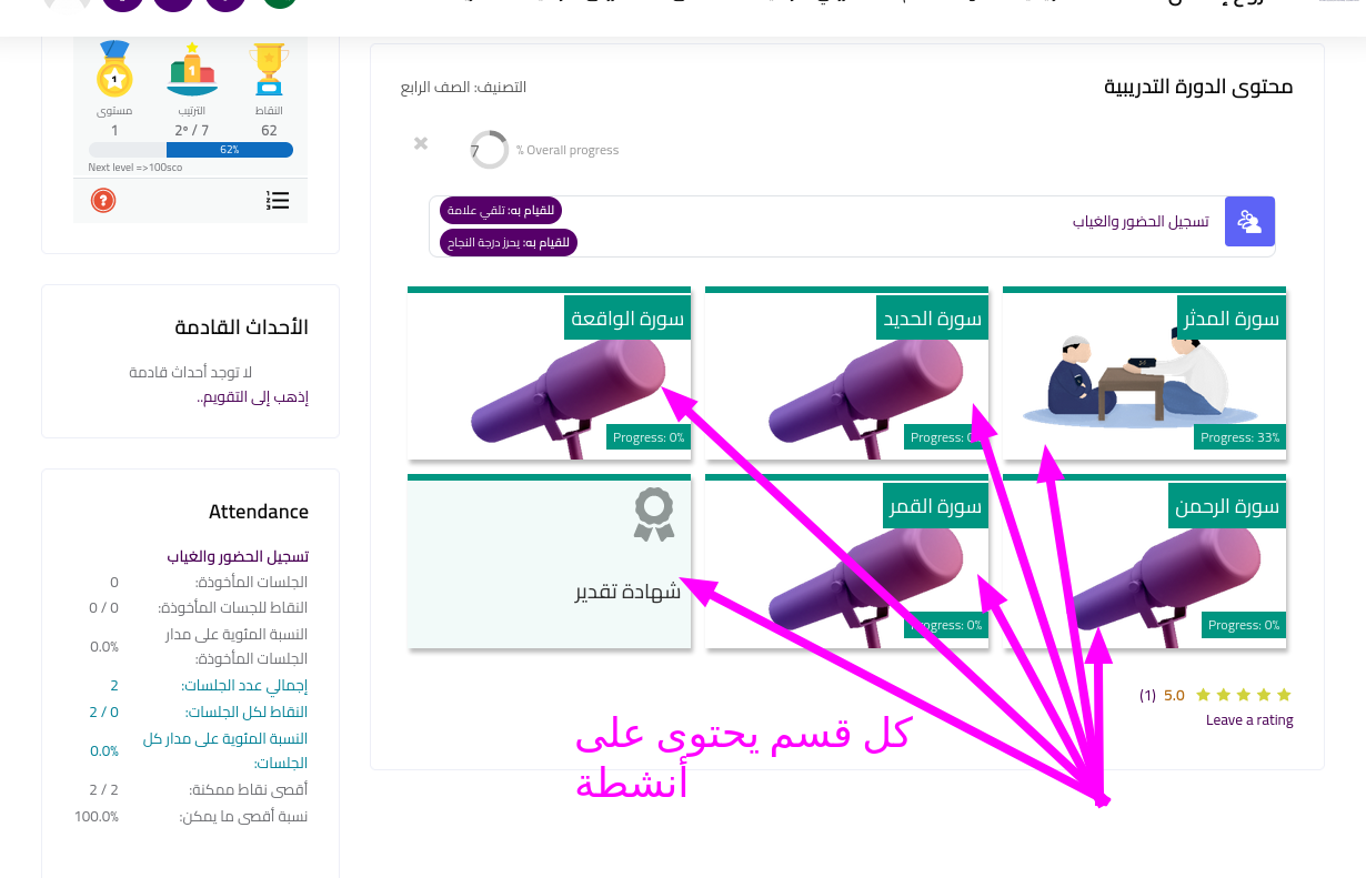 عند الدخول الى الدورة عن طريق الضغط على اسم الدورة او الوصول السريع لاحد انشطة الدورة ستجد شاشة الدورة كما هو موضح بالصورة وفيها :اقسام الدورة شريط التقدم سجل الحضورنقاط التقدم